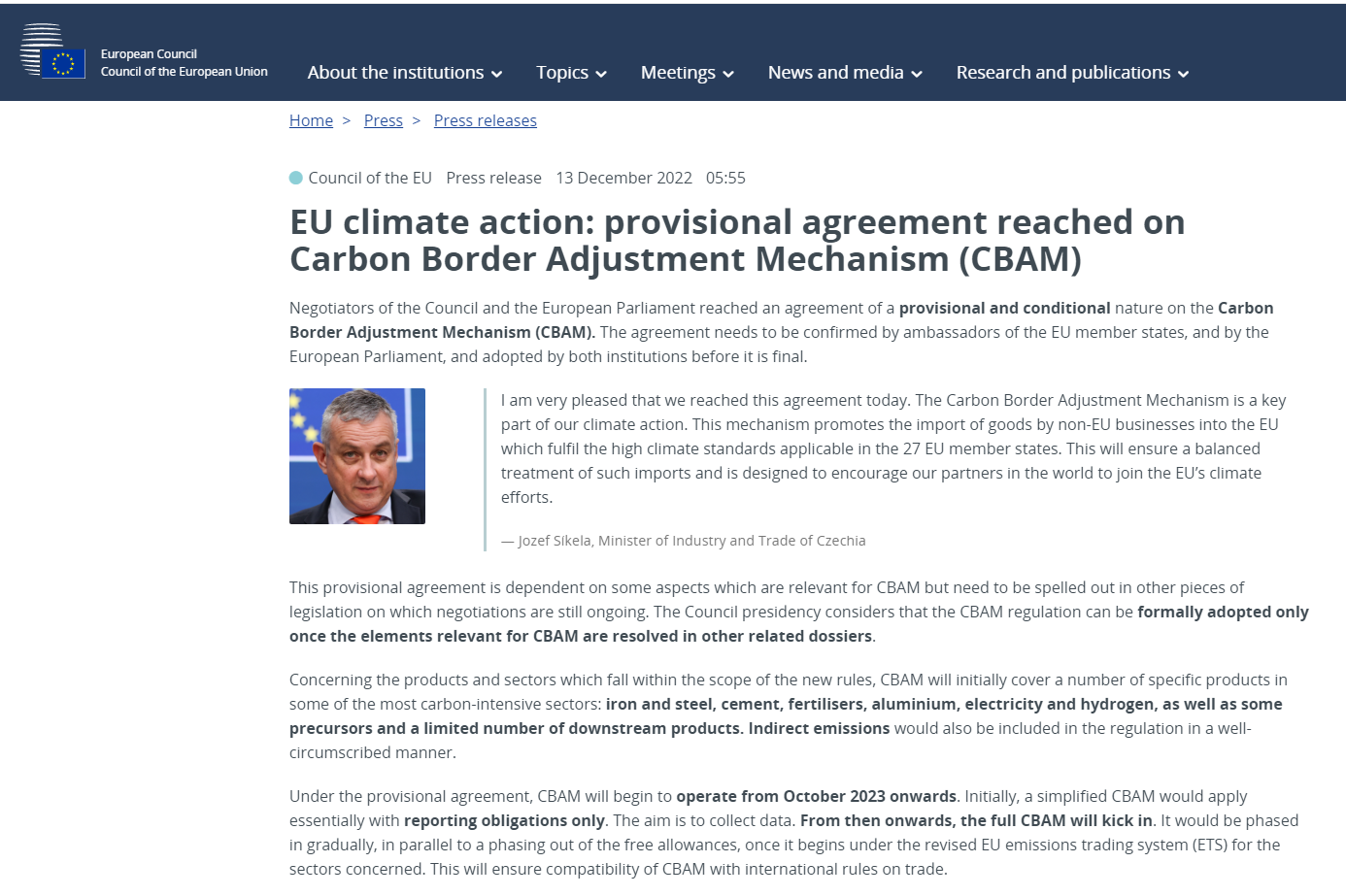 2022年3月,欧盟理事会通过了CBAM的“总体方针”,CBAM距离实施再进一步。