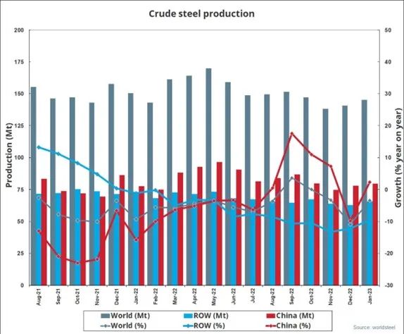 上述地区含63个产钢国提交的数据,其2022年产量占全球粗钢产量的97%。