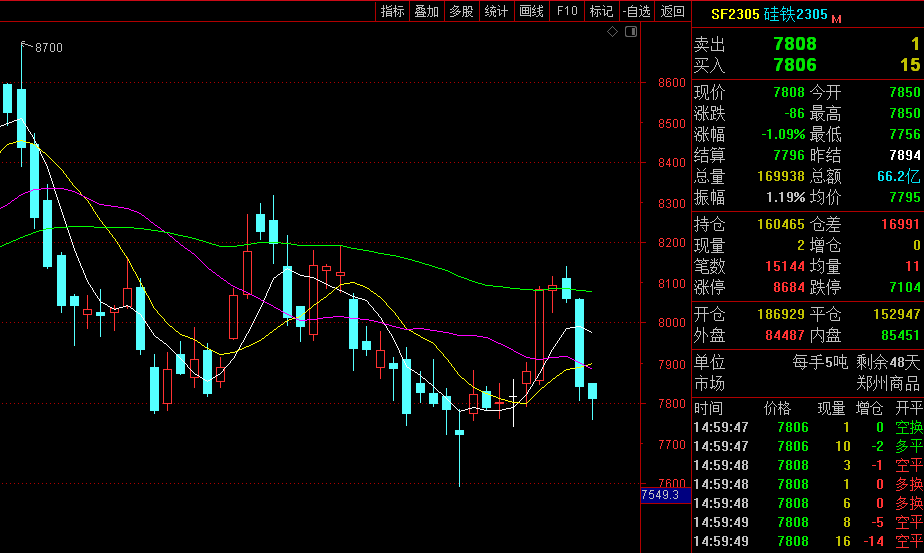 3月30日硅铁期货2305合约开盘价7850,最高价7850,最低价7756,收盘价7808,结算价7796,成交量169938,持仓量160465,跌幅1.09%。