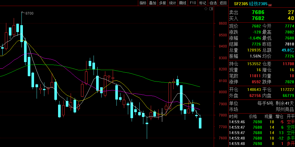 4月6日硅铁期货2305合约开盘价7774,最高价7802,最低价7680,收盘价7682,结算价7726,成交量128935,持仓量153552,跌幅1.64%。