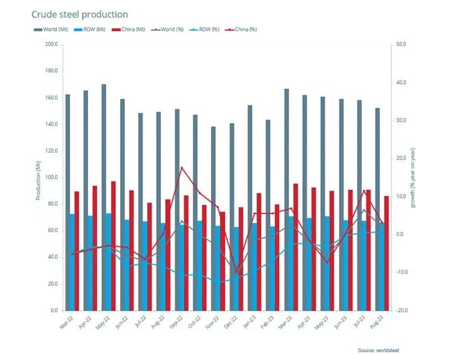 中国铁合金网:2023年8月全球63个纳入世界钢铁协会统计国家的粗钢产量为1.526亿吨,同比提高2.2%。
