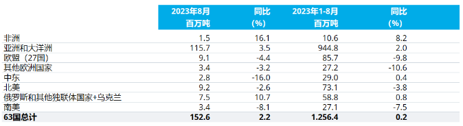 2023年8月,非洲粗钢产量为150万吨,同比提高16.1%;亚洲和大洋洲粗钢产量为1.157亿吨,同比提高3.5%;欧盟(27国)粗钢产量为910万吨,同比下降4.4%;其他欧洲国家粗钢产量为340万吨,同比下降3.2%;中东粗钢产量为280万吨,同比下降16.0%;北美粗钢产量为920万吨,同比下降2.6%;俄罗斯和其他独联体国家+乌克兰粗钢产量为750万吨,同比提高10.7%;南美粗钢产量为340万吨,同比下降8.1%。