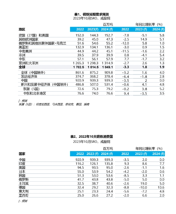 钢铁需求继2022年下降2.6%后,预计2023年将继续下降1.1%,2024年将增长1.6%。