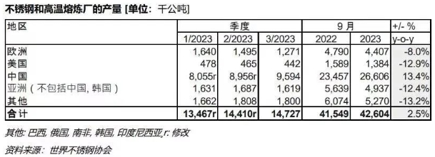 2024年1月8日,世界不锈钢协会发布的2023年前九个月的数据表明,全球不锈钢粗钢产量与去年同比增长2.5%,达到4260万公吨。