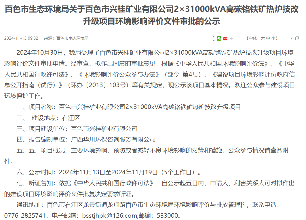 2024年11月13日,广西百色市生态环境局就百色市兴桂矿业有限公司2×31000kVA高碳铬铁矿热炉技改升级项目环境影响评价文件作出审批意见并对外进行公示,公示时间:2024年11月13日至2024年11月19日(5个工作日)。