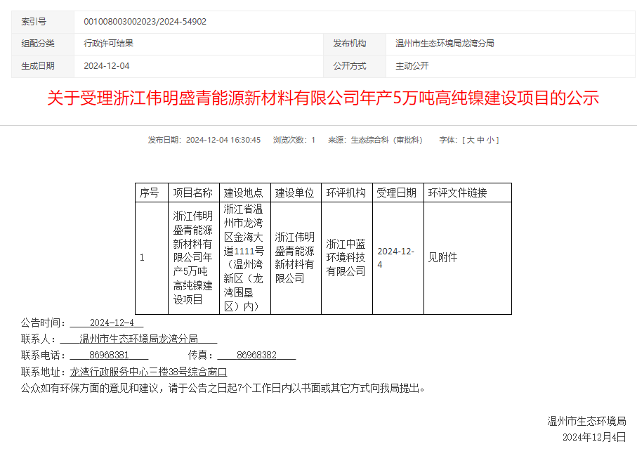 2024年12月4日,温州市生态环境局龙湾分局受理浙江伟明盛青能源新材料有限公司年产5万吨高纯镍建设项目环境影响评价报告表并对外进行公告,公告期:7个工作日。