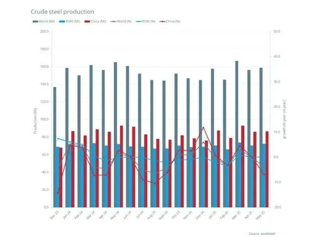 中国铁合金网:2025年5月全球70个纳入世界钢铁协会统计国家/地区的粗钢产量为1.588亿吨,同比下降3.8%。