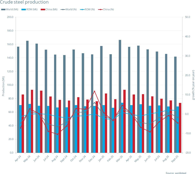 中国铁合金网:2025年9月全球70个纳入世界钢铁协会统计国家/地区的粗钢产量为1.418亿吨,同比下降1.6%。