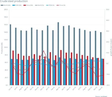 中国铁合金网:2025年11月全球70个纳入世界钢铁协会统计国家/地区的粗钢产量为1.401亿吨,同比下降4.6%。