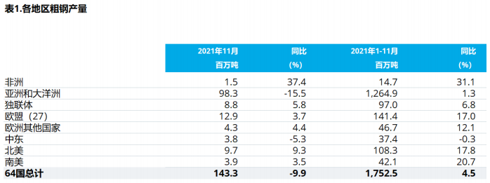 国家统计局数据显示,2021年11月全国粗钢产量6931万吨,同比下降22.0%,1-11月累计产量94636万吨,同比下降2.6%。 |