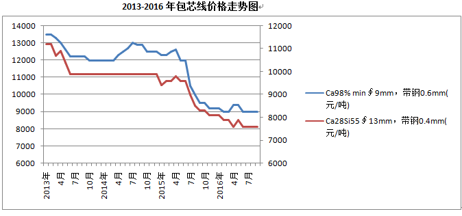 中国铁合金网讯:9月中旬,包芯线用带钢价格下滑,现已维稳运行。包芯线用原料价格变动不一,硅钙合金仍坚挺无波动,金属钙上行强势。厂商方面报价稳定,挺价属实不易。 |