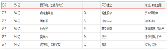 10月13日,胡润研究院发布了《2016胡润百富榜》,宁夏4人上榜,天元锰业董事长贾天将、东菊凤夫妇以55亿元身价排名全国第696名,这也是贾天将首次入围胡润百富榜。 |