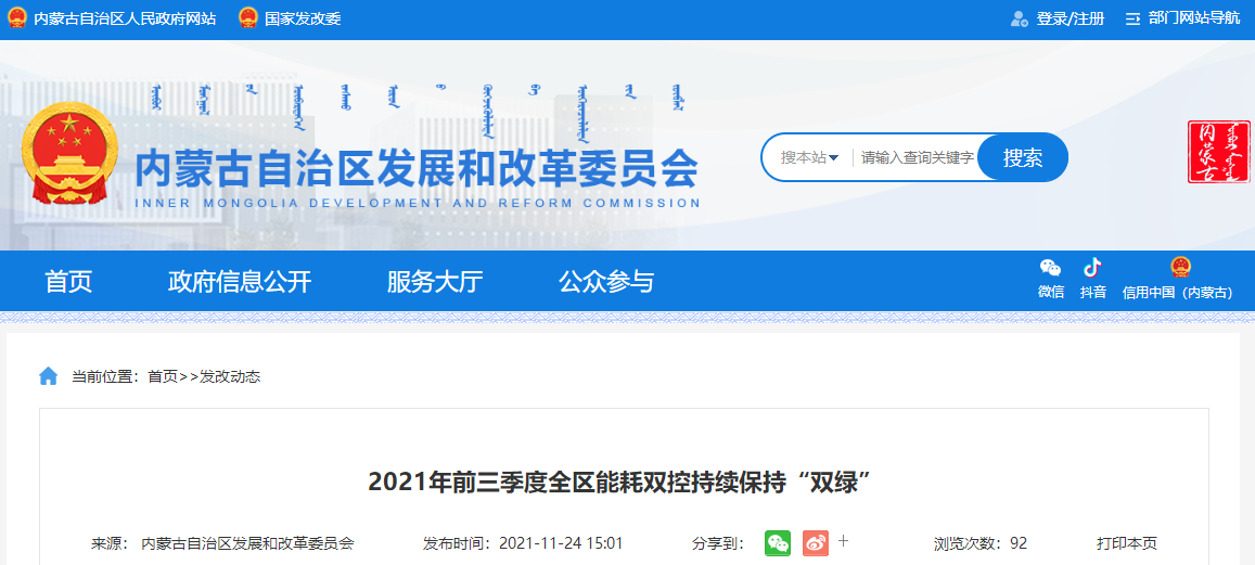 内蒙古发改委:2021年前三季度全区能耗双控持续保持“双绿”