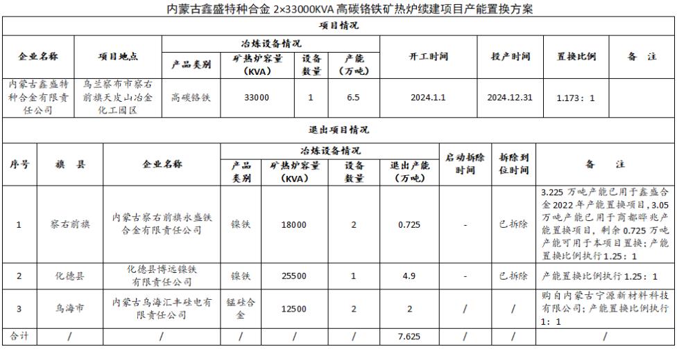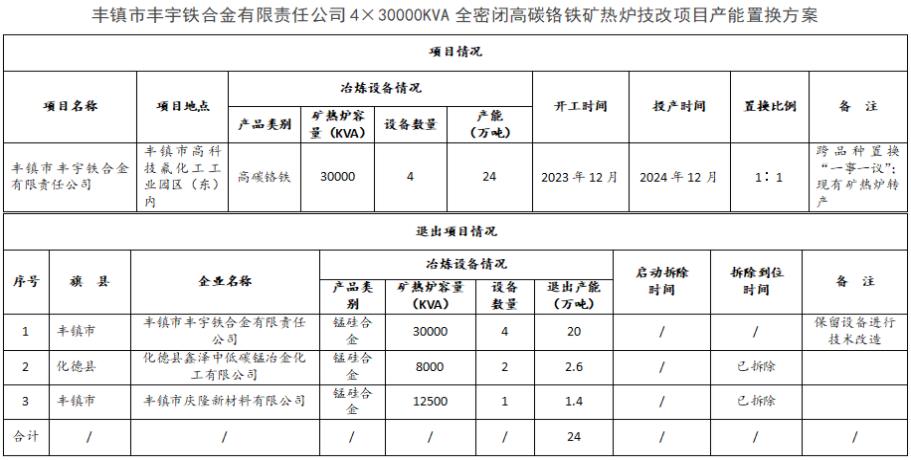 关于丰镇市丰宇铁合金有限责任公司全密闭高碳铬铁矿热炉技改项目 产能置换方案的公告