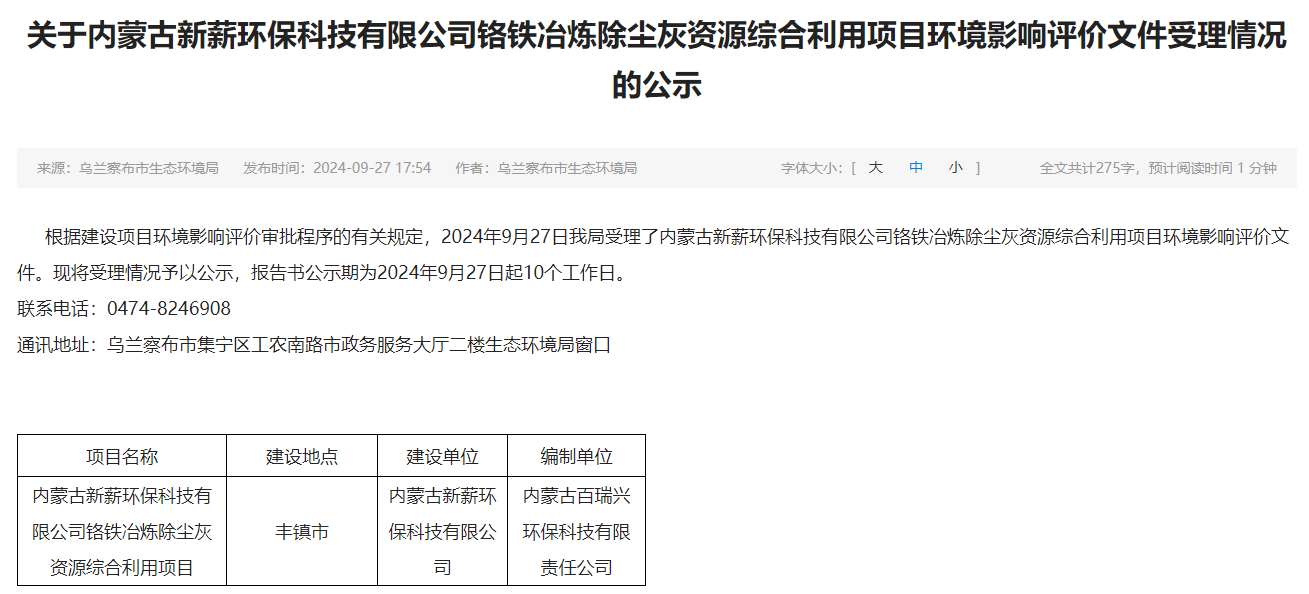 卓资县锦盛化工有限责任公司2X33MVA全密闭高碳铬铁电炉工程原料配料系统改造项目环评获受理