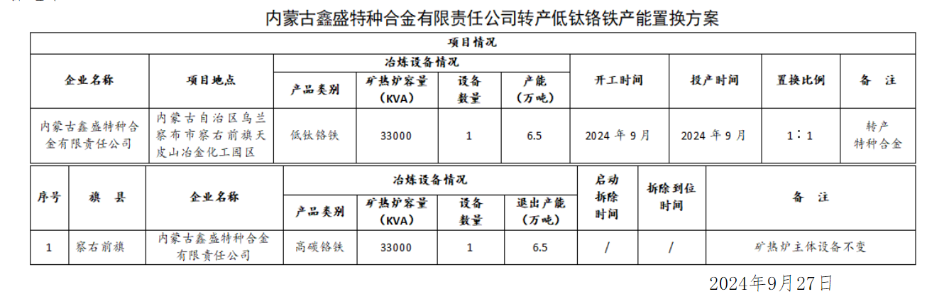 关于化德县蒙誉铁合金有限公司1×30000KVA全密闭矿热炉转产低钛铬铁项目产能置换方案的公示 |