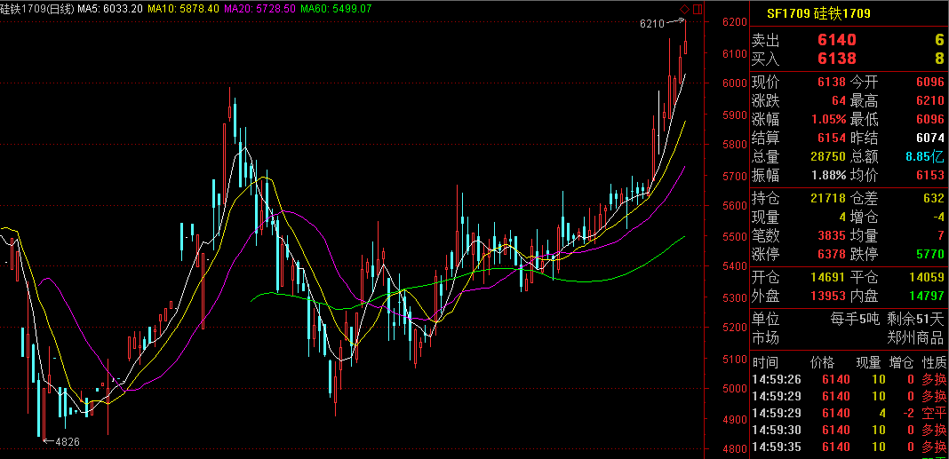 中国铁合金网讯:本周柜内硅铁市场持续高温状态,势头强劲,已突破6 字大关。自六月以来,硅铁市场持续升温,报价周周上调,可谓是一天一个价。 |