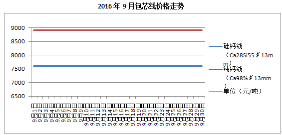 中国铁合金网讯:9月,包芯线市场呈低位稳定运行,价格无明显波动。生产企业大都正常生产,终端钢厂招标需求较为稳定,包芯线产品报价及主流成交价与8月相比维稳。截止到2016年9月30日,硅钙线(Ca28Si55∮13㎜)价格为7500-7700元/吨,;纯钙线(Ca98%min∮9㎜)价格为8800-9000... |