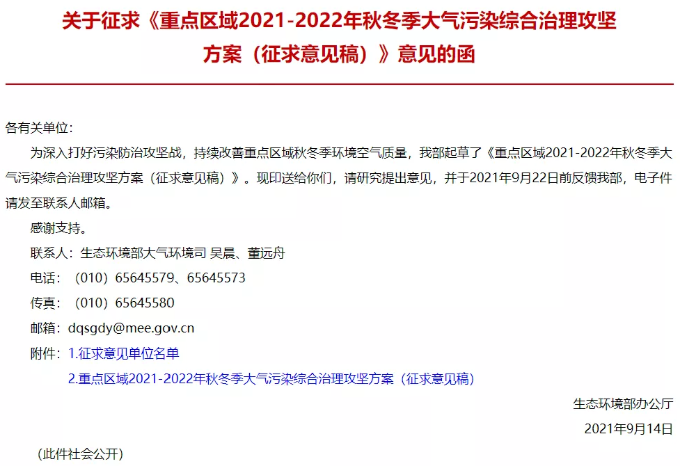 环境部发布《重点区域2021-2022年秋冬季大气污染综合治理攻坚方案》征求意见稿