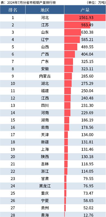 2024年1-7月河北以产量12910.46万吨位列第一;江苏产量7241.42万吨排在第二;山东产量4440.7万吨排在第三。 |