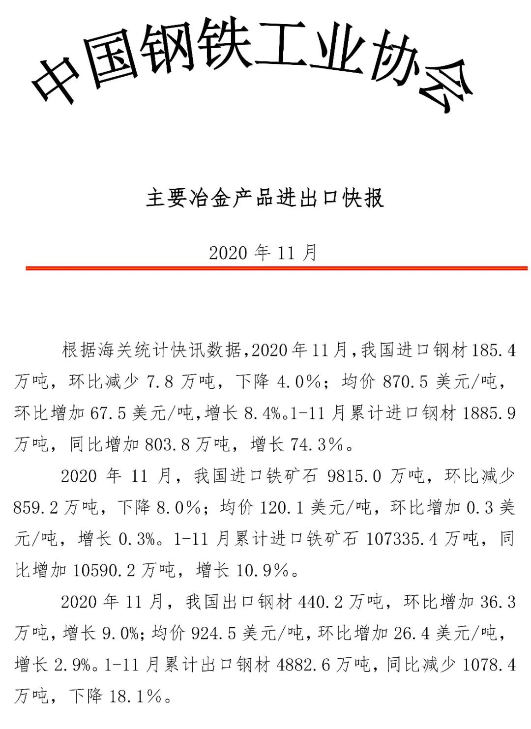 中国铁合金网讯:2020年11月份国内粗钢产量8766万吨,同比增长8.0%,2020年1-11月份粗钢产量9.6116亿吨,同比增长5.5%。 |