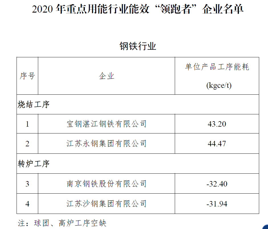 宝钢湛江,江苏永钢,南京钢铁,沙钢集团入选2020 年重点用能行业能效“领跑者”企业名单 |