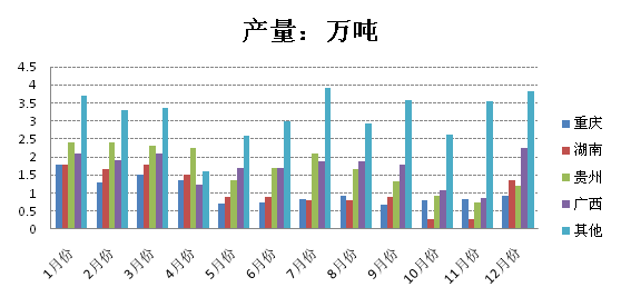 据不完全统计,2015年,国内主产区电解锰片99.7%产量近104.09万吨。从各月份来看,每月产量各不相同,跟各地区工厂开工情况息息相关。其中,国内最大电解锰生产工厂为宁夏天元锰业,其产量位居第一,其次为广西和贵州地区。 |