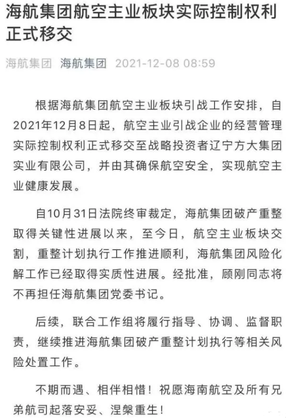 12月8日,海航集团微信公众号发布消息称,其航空主业引战企业的经营管理实际控制权正式移交至战略投资者辽宁方大集团实业有限公司。 |