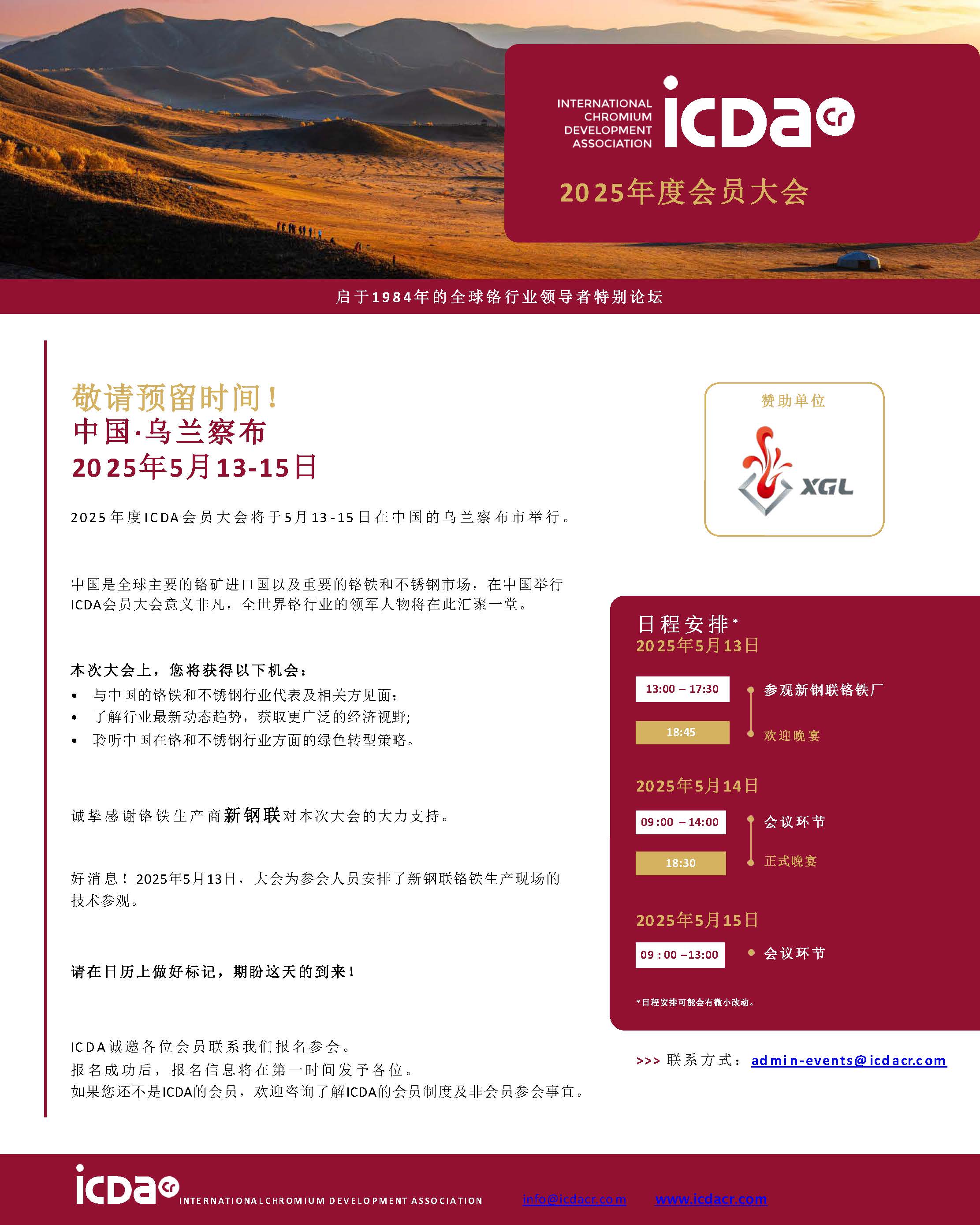 |  | 2025年度ICDA会员大会将于5月13-15日在中国的乌兰察布市举行 由中国铁合金网主办的第21届中国铁合金国际会议定于2025年5月28日-30日在北京市召开,我们诚邀您相聚北京,共同展望2025年铁合金发展趋势! |