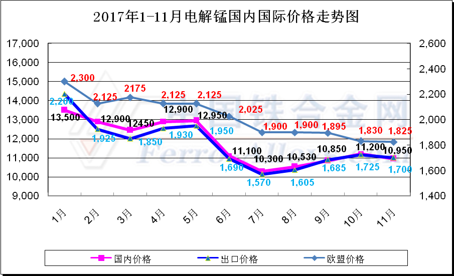 11月,电解锰整体市场行情坚挺后弱势运行。生产成本上涨锰企报价坚挺,但因下游需求没见好转,电解锰产量较前期增加,电解锰市场价格上涨困难,维稳后继续下跌。 |