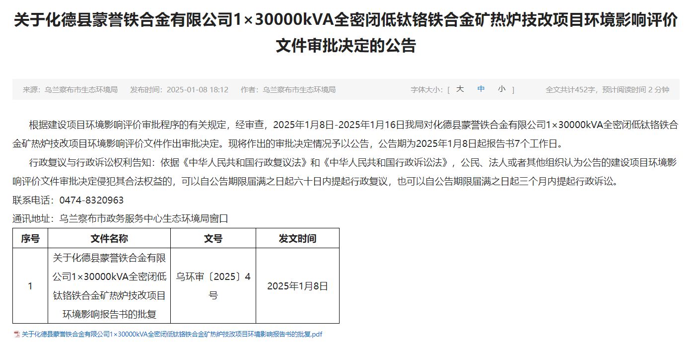 2025年1月8日,乌兰察布市生态环境局就化德县蒙誉铁合金有限公司1×30000kVA全密闭低钛铬铁合金矿热炉技改项目环境影响评价文件作出审批决定并对外进行公告,公告期为2025年1月8日起报告书7个工作日。 |