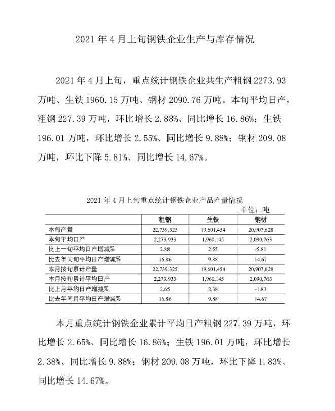 统计局一季度我国粗钢产量27,104万吨,同比增长15.6%,生铁产量22,097万吨,同比增长8.0%, 钢材产量32,940万吨,同比增长22.5%,焦炭产量11,897万吨,同比增长8.6%, |