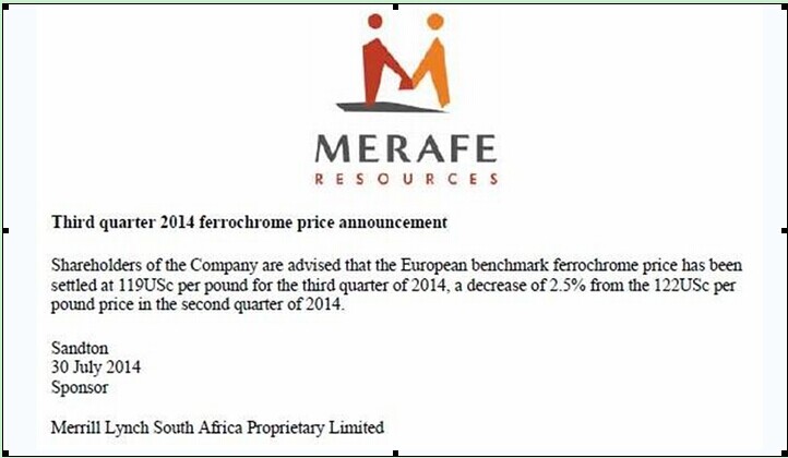 [Ferro-Alloys.com]The European ferrochrome benchmark in quarter 3, 2014 was settled at USD1.19/1b, decreasing by 2.5% month on month while rising by 5.7% year on year.