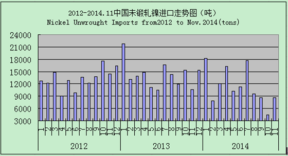 [Ferro-alloys.com]According to the statistics, unwrought nickel imports of China in recent five years present a downturn trend. In 2010 and 2011, total import volume of unwrought nickel was 180-210thousand tons while in 2012 and 2013 it declined to 160-170thousand tons. in the first 11monts of 2014, total imports was just 125thousand tons, decreasing by 18.8% and 11.9% compared with that of 2013 and 2012, of which Russian unwrought nickel increased by 3.2% to 72,765tons, Canada’s declined by 21% to 18,470tons, Japan’s fell by 15.2% to 7,975tons, South Africa’s down by 4.4% to 5,412tons and Norway’s dropped by 84.5% to 3,582tons.