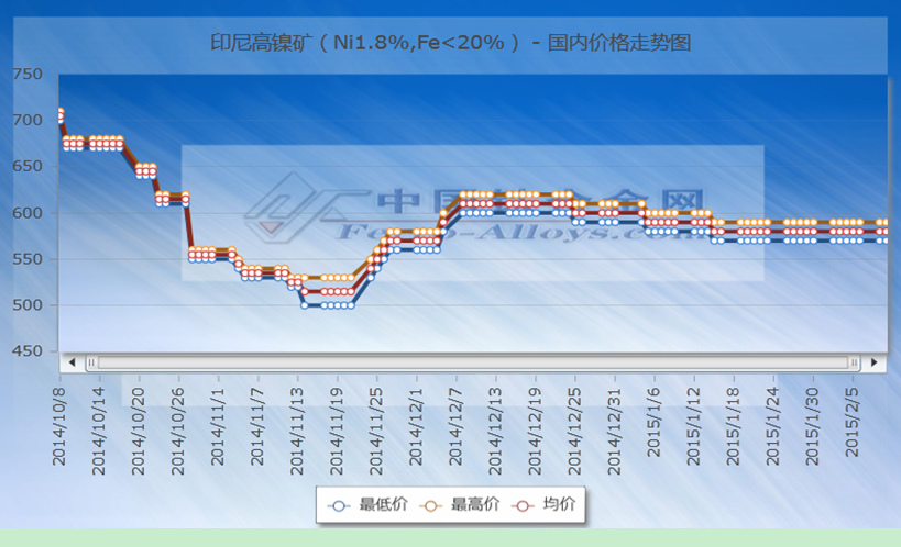 In mid-Nov. of 2014, the high grade nickel ores spot was quoted at RMB500-530/wet mt and in mid-Dec., it rebounded to RMB600-620/wet mt. from Jan. to early Feb., the price was weakly stayed at RMB570-590/wet mt.