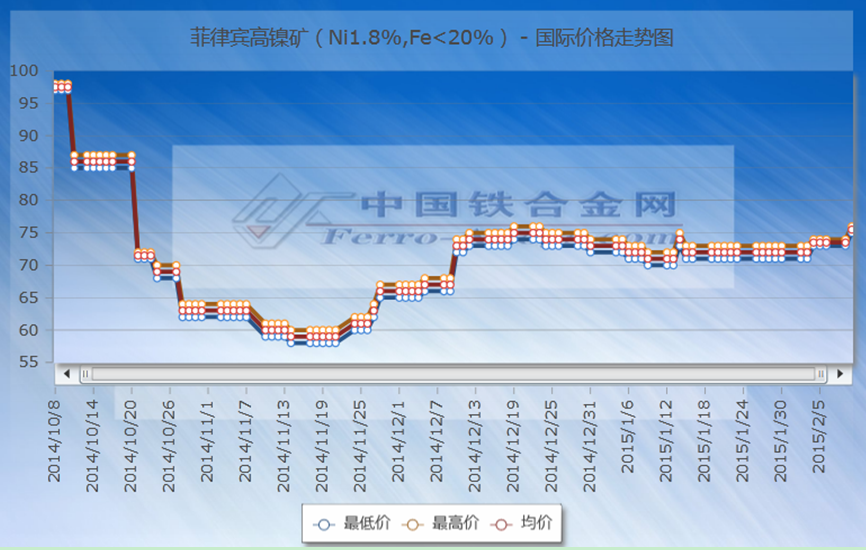 In mid-Nov., the FOB price of high grade nickel ores with Ni1.8% was quoted at USD58-60/wet mt and it then improved to USD73-75/wet mt. Despite of the slightly decline in early Jan. of 2015, the price rebound to USD75-76/wet mt in early Feb..