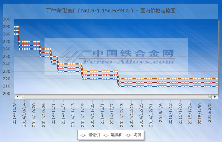 [Ferro-alloys.com]In the six months as of early February 2015, the low grade nickel ores price in Chinese market continued to decline with drop rate of 43%. In mid-Feb., the Ni ore with Ni0.9-1.1%,Fe49% was quoted at RMB210-220/wet mt.
