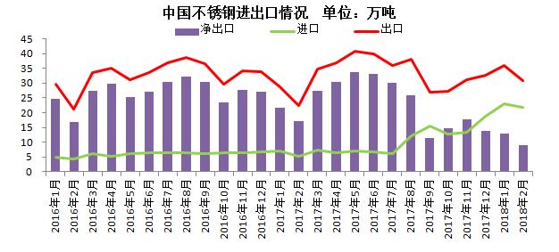 [ferro-alloys.com]In February, 2018, China exported 0.307 million tons stainless steels. It decreased 14.6% compared to the volume last month,and it increased 37.2% compared to the volume in the same period last year. In the same time, China imported 0.218 million tons stainless steels. Compared to the same period last year, it added 313.8%, and the volume declined 5.2% compared to the volume last month.The net exported volume is 89000 tons that decreased 31.4% compared to the volume last month. It declined 47.9% compared to the volume last month.