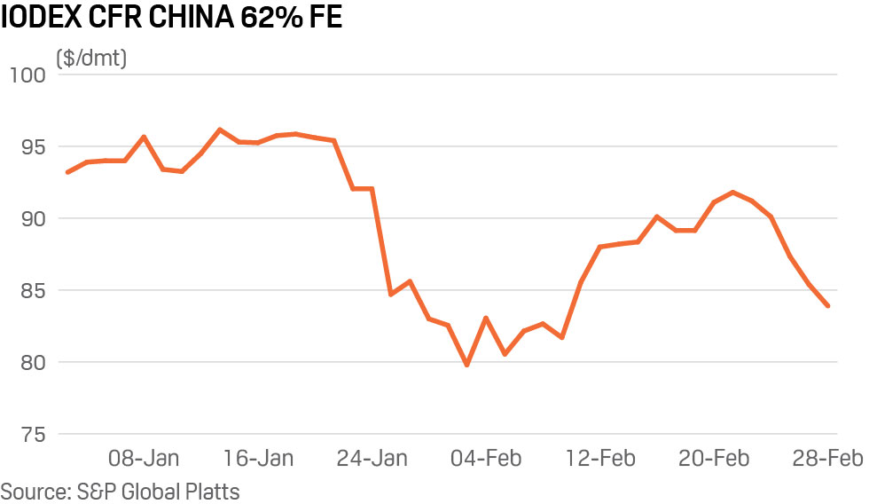 S&P Global Platts assessed the 62% Fe IODEX down $7.90/dmt week on week at $83.90/dmt CFR China Friday as expectations faded for a recovery in downstream steel demand in the second quarter while the coronavirus outbreak continues to spread beyond China.
