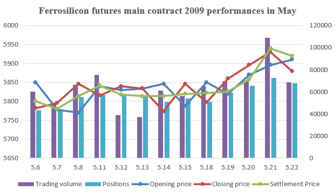[Ferrosilicon futures 2005 contract] Opening price of ferrosilicon futures 2005 contract of this week was 5850, highest price was 5992, lowest price was 5782, closing price was 5880 and the settlement price was 5920. The positions were 67923 and the trading volumes were 382246.