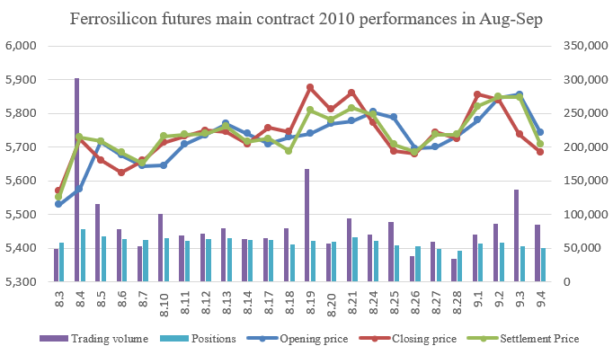 [Ferrosilicon futures 2010 contract] Opening price of ferrosilicon futures 2010 contract of this week was 5,748, highest price was 5,924, lowest price was 5,672, closing price was 5,686 and the settlement price was 5,710. The positions were 50,360 and the trading volumes were 433,708.