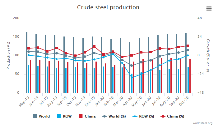 World crude steel production for the 64 countries reporting to the World Steel Association (worldsteel) was 161.9 million tonnes (Mt) in October 2020, a 7.0% increase compared to October 2019. Due to the ongoing difficulties presented by the COVID-19 pandemic, many of this month’s figures are estimates that may be revised with next month’s production update.