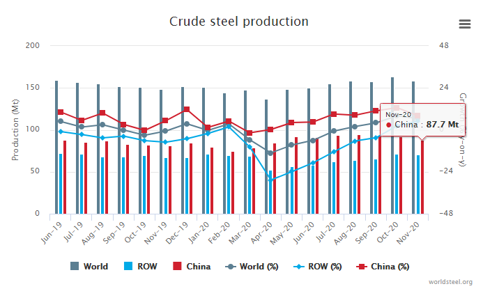 World crude steel production for the 64 countries reporting to the World Steel Association (worldsteel) was 158.3 million tonnes (Mt) in November 2020, a 6.6% increase compared to November 2019. Due to the ongoing difficulties presented by the COVID-19 pandemic, many of this month’s figures are estimates that may be revised with next month’s production update.