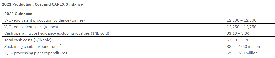 • V2O5 equivalent production of 12,000 – 12,500 tonnes; V2O5 equivalent sales of 12,250 – 12,750 tonnes; Cash operating cost excluding royalties2 of $3.10 – 3.30/lb V2O5 sold; Total cash costs of $3.50 – 3.70/lb V2O5 sold;