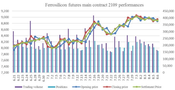 Opening price of ferrosilicon futures 2109 contract of this week was 8900, highest price was 9076, lowest price was 8804, closing price was 8934 and the settlement price was 8898. The trading volumes were 1054057 and the positions were 159574.