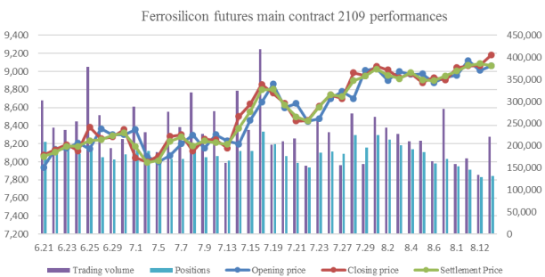 Opening price of ferrosilicon futures 2109 contract of this week was 8934, highest price was 9198, lowest price was 8830, closing price was 9180 and the settlement price was 9066. The trading volumes were 967917 and the positions were 130984.