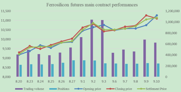 The tone of steel bidding in September was established last Friday with the bidding price of HBIS Group at 10700 yuan per ton, which increased 1500 yuan per ton and the volume at 2735 tons. The bidding of steel mills was coming to an end this week, and the ferrosilicon spot market continued to operate at a high level, although the range of increase has slowed down. The manufacturer's sales were good, and the market inventory was not much. After a short fall, the futures hit a new high, breaking through 11000 yuan per ton (the highest price was up to 11346 yuan per ton), a new high since the listing of ferrosilicon futures. In addition to the support of production raw material cost, the market mentality was good, and the wait-and-see mood was also strong - on the one hand, there were negative factors such as the production of new arc furnaces in Ningxia and Qinghai, and the strict implementation of production restriction in downstream steel mills. On the other hand, there were continuous news of cut production and power restriction in main production areas. Generally speaking, it's expected that the domestic ferrosilicon market would be easy to rise but difficult to fall in the short term. Wait for the news to become clearer.