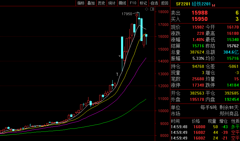The weekly opening price of 2201 main contract of ferrosilicon futures this week was 17,666, the highest price was 17,950, the lowest price was 15,100, the closing price was 15,982, the settlement price was 15,716, the trading volume was 1,968,426, and the position was 94,768, a decrease of 1.99%.