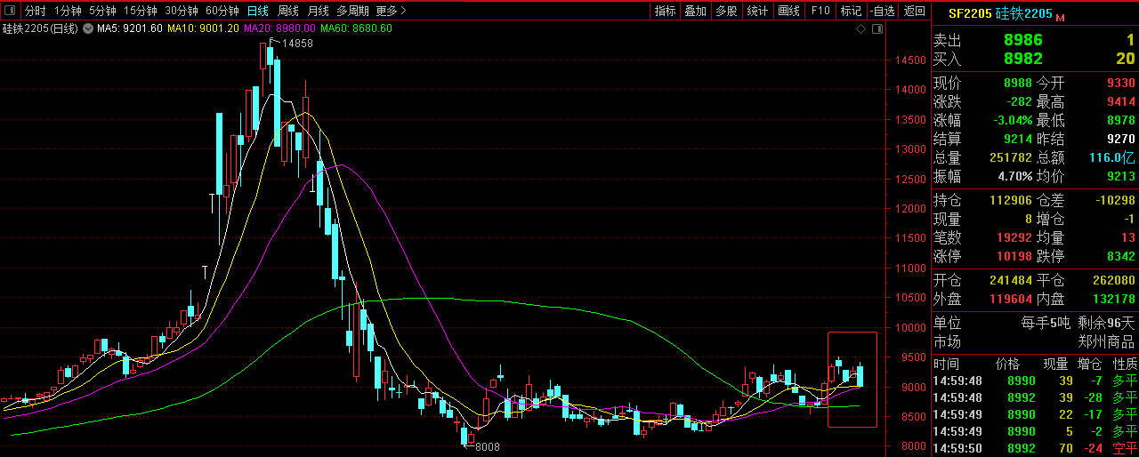 The opening price of 2205 main contract of ferrosilicon futures this week was 9,100, the highest price was 9,496, the lowest price was 8,978, the closing price was 8,988, the settlement price was 9,214, the trading volume was 1,131,040, and the position was 112,906, an increase of 0.40%.
