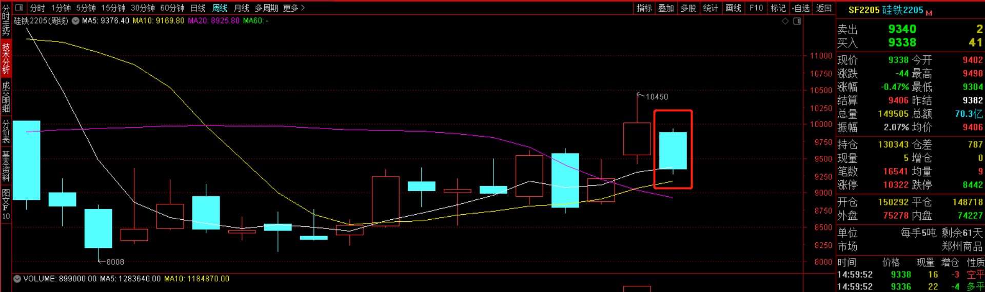 This week, the opening price of 2205 main contract was 9,880, the highest price was 9,934, the lowest price was 9,260, the closing price was 9,338, the settlement price was 9,406, the trading volume was 899,014, and the position was 130,343, a decrease of 6.32%.